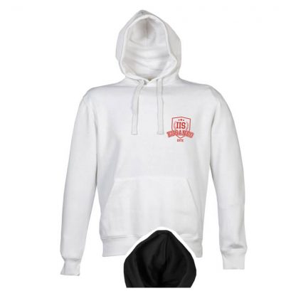 Felpa 65% Cotone e 35% Polyestere con cappuccio foderato in jersey.